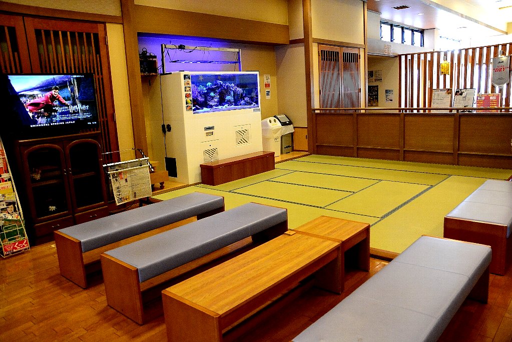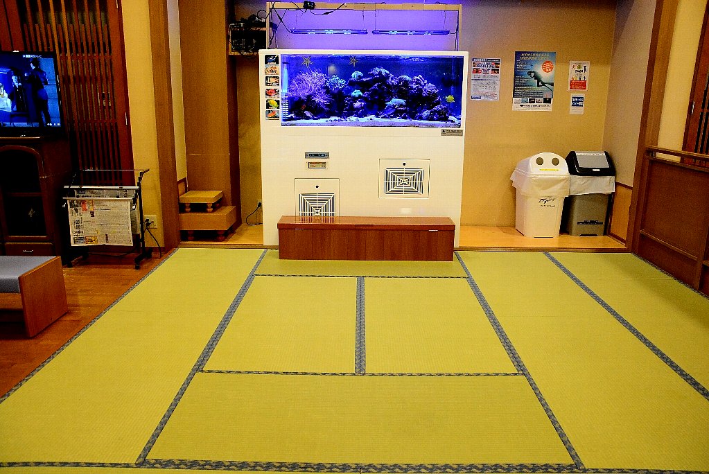お風呂から上がったお客さんがくつろげるスペースの前には、色鮮やかな水槽の中に海水魚が優雅に泳いでいます。