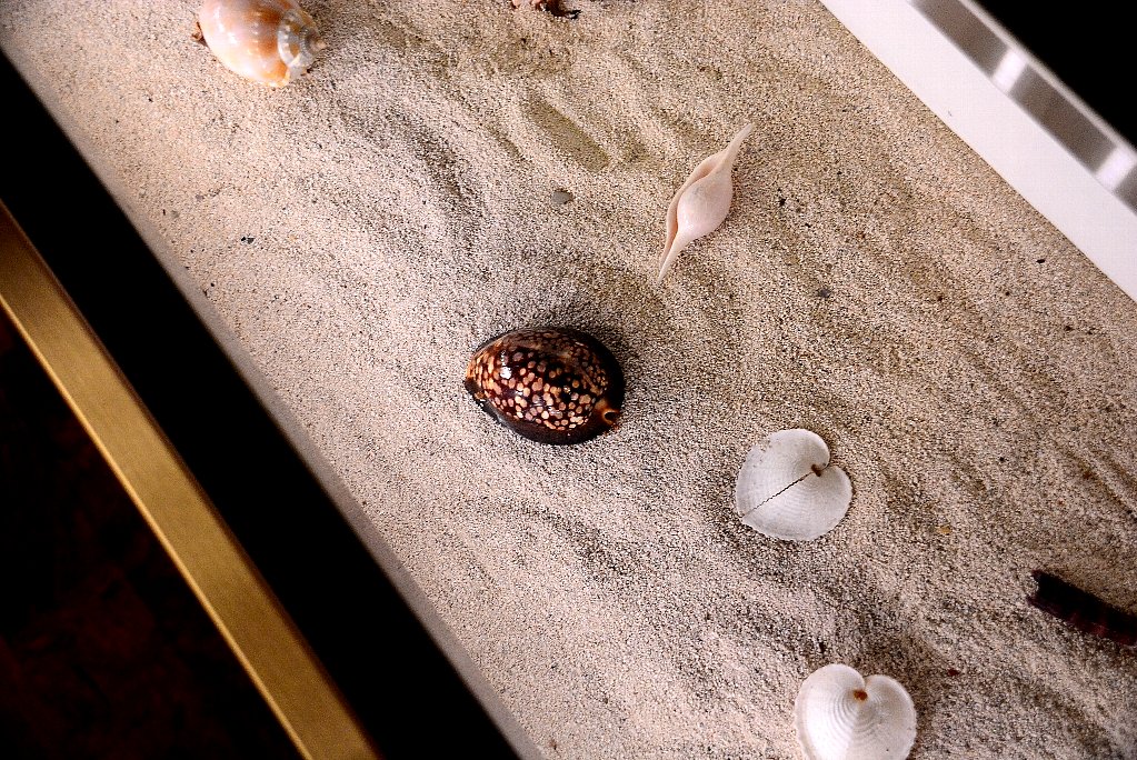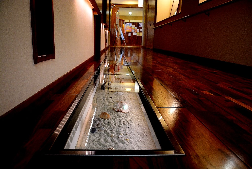 岩盤浴へ通じる廊下には、ガラス貼りの「床下貝博物館」が。