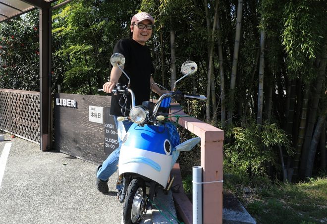 オーナーはこの人、藤田雅也さん。41歳。意外にも都会的なキャラ。このシチュエーションからはイメージできませんでした。てっきり、長靴を履いて頭にタオルを巻いた感じのオジサンが登場すると妄想していたので(笑)。こりゃ失敬!「このバイクは知り合いが持ってきてくれたんですよ~。アクアショップなんだからモチーフはやっぱり魚でしょということで、こんなラッピングバイクになりました(笑)」。