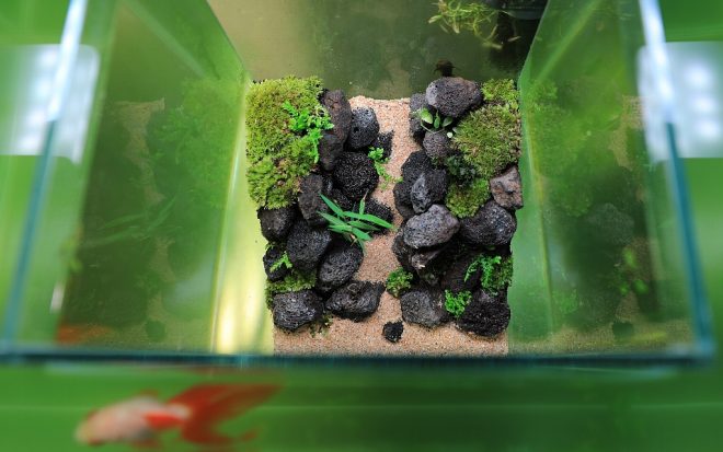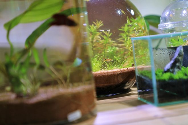 ひときわ異彩を放っていたのが、水槽イン水槽。金魚が泳ぐ水槽とテラリウムがレイアウトされたコンパクト水槽とが同居。金魚があたかもコケの前を通りすぎていくという、ありえない光景。金魚にとってこれが自然との共存であるなら、これもまた藤田さんの生きざまそのもののような気がしました。