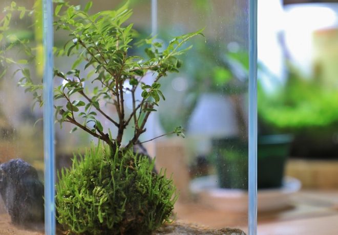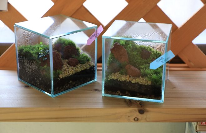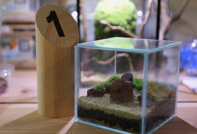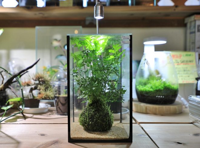 これはコケ玉を使ったコンパクト水槽。コケ玉というと一般的にはお皿などにちょこんと置いて楽しむものだと思っていたので、ちょっと珍しいですね。「ハイゴケを使っている点では、一般的なコケ玉と同じです。ただ、水槽などの密閉型の容器に入れることで湿度がベストに保たれて、ハイゴケもこんなに元気に育つんです」。これもある意味放置プレイ(笑)。