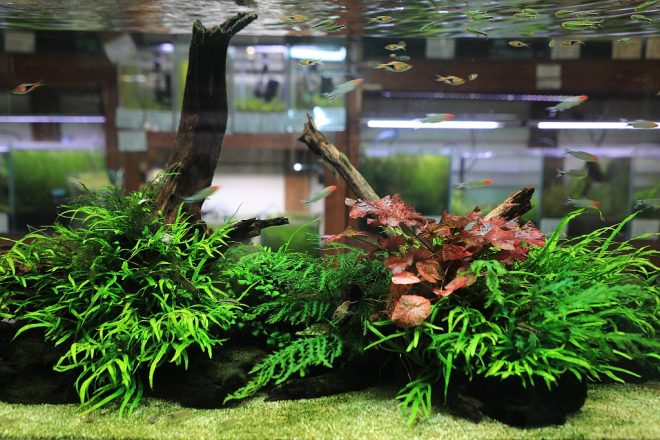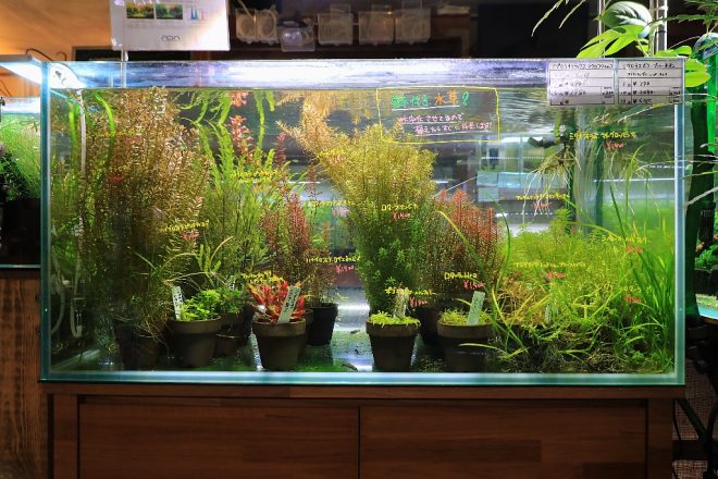 こちらは水草販売用の代表水槽。1200のKOTOBUKI製。どの水草も無農薬で栽培し、成長するとカットして販売。そんな水草が鉢に植えられた状態で、店内のあちこちで水槽展示されています。例によって脇役を務めるのは、ランプアイのなかまでもあるアプロケイリティクスマクロフタムルスや、クリアなグリーンがきれいなミクロラスボラブルーネオンなどなど。