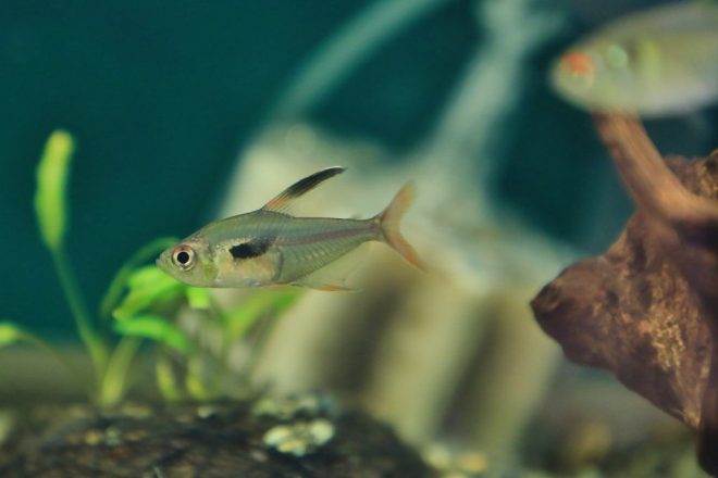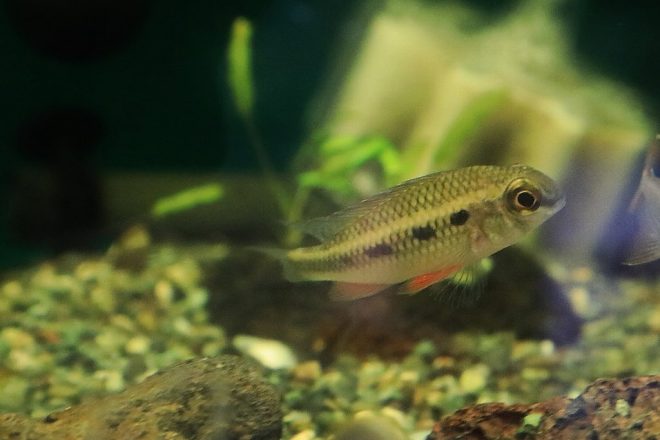 珍しいカラシン系のハイフェソブリコンエピカリス。アマゾン川に生息しているものの、この魚が採れる場所を知っている漁師さんが亡くなり、もはや入手は超困難とか。もし所有している人がおられたらぜひお申し出を(笑)。オスは繁殖期に婚姻色が出て身体が赤くなるのが特徴。