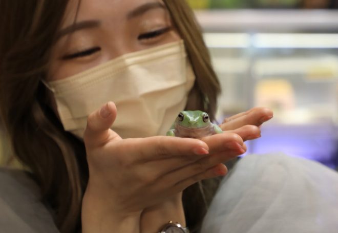 「爬虫類も大好きなんです~」と、イエアマガエルを手のひらにのせてアピール。聞いてみると、自宅ではアクアリウムのほかヘビやリクガメ、イグアナなどとも同居。しかも2本の60㎝水槽や上部フィルターも、KOTOBUKIなのだそう。もしかして今日はKOTOBUKIデー(笑)?