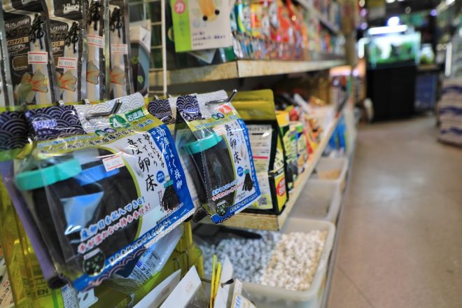 メダカシーズンに入って、産卵床は必需品。同様の商品は数多くラインナップされていますが、梅宮さんが着目したのはこれ。4個入りの産卵床。「単体売りが多い中で、複数入っているのはかなりお得です。パッケージのデザインも認知しやすく、売れる要素が十分あると判断しました。売れ行き好調です」。いける!と思ったら、すぐにやる。そして躊躇なくアピールする。当たり前のことかも知れませんが、こうしたひとつひとつの積み重ねが好結果につながっているようです。