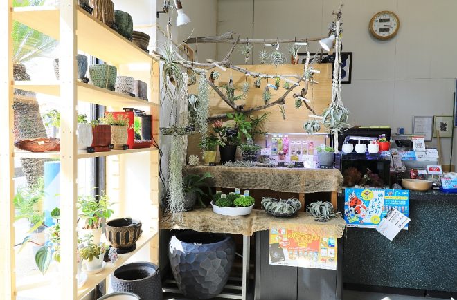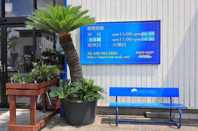 プランツを中心にした、まるでおしゃれな雑貨ショップのようなノリ。これらはほとんどグリーンが大好きな奥様の仕業だと聞いてまたビックリ(笑)。誰でも気軽に入れるショップにしようと、奥様が積極的に提案した結果なのだそうです。要するに、ダンナが魚に夢中になっている間にヨメがプランツを物色中という青写真。お客さんもゆっくりできるし、リピーターも増えるわけですね。これぞイブのダブル効果!いやあ、奥様リスペクトしちゃいます(笑)