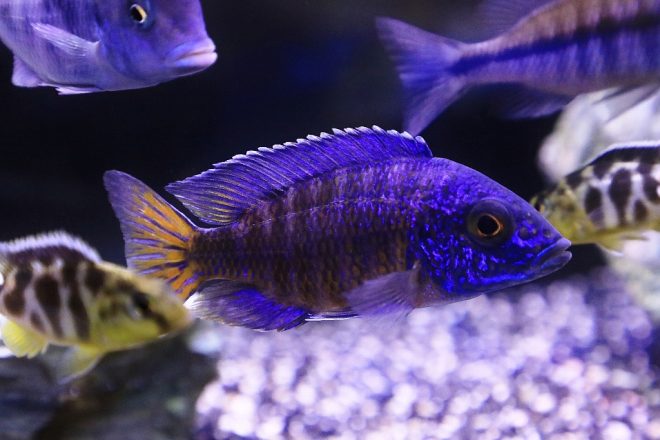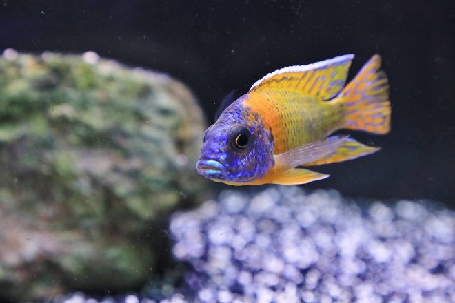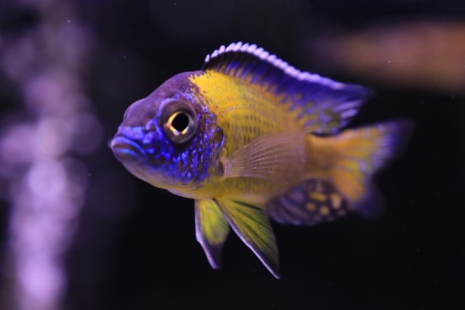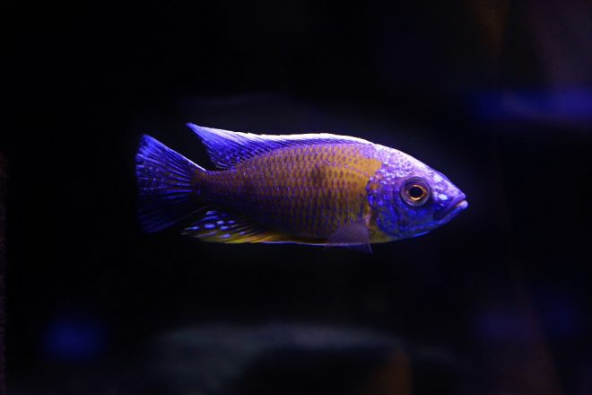 マラウィ湖に棲むアウロノカラ ステベニィ ウジスヤ(ドイツブリード)。どれもこれも、独特のカラーリング。どちからというと、タンガニイカ湖のシクリッドよりマラウィ湖のシクリッドのほうが、大型で発色のきれいなものが多いようです。鮮やかでおしゃれ。そして、水槽で飼育するにはちょうどいいサイズ感。シクリッドにハマっていく人の気持ちがわかるような気がします。