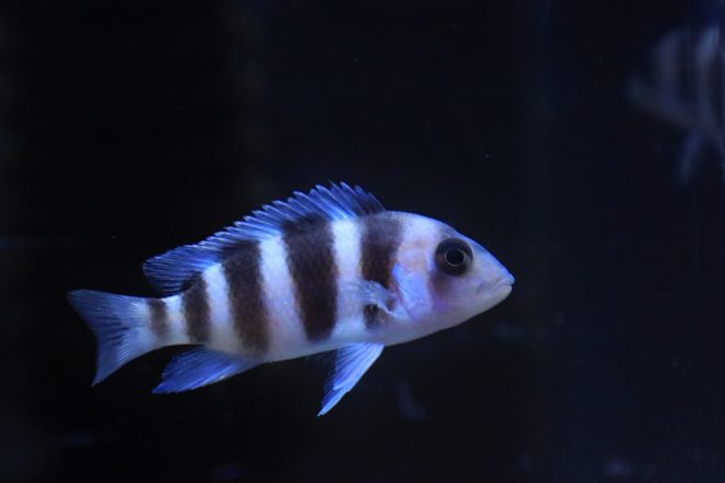 プセウドトロフェウス ゼブラ マイソニー リーフ(ワイルド)。アフリカ・マラウィ湖で最も種類が多いのですが、縄張り意識が強く混泳には注意が必要です。