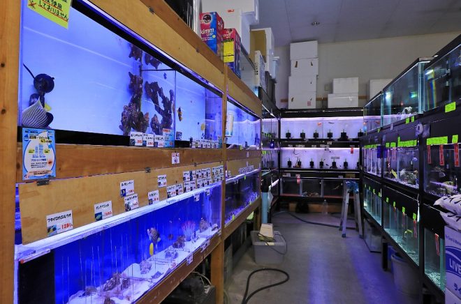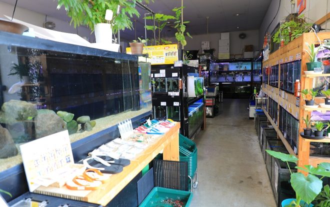 オープン前、お客さんがゆっくり回遊できるような余裕のある店にしたかったという通り、生体・用品ゾーンともに歩行空間はゆったり。ここまで広ければ、メンテだってやりやすいことでしょう。