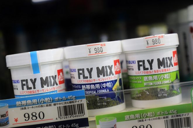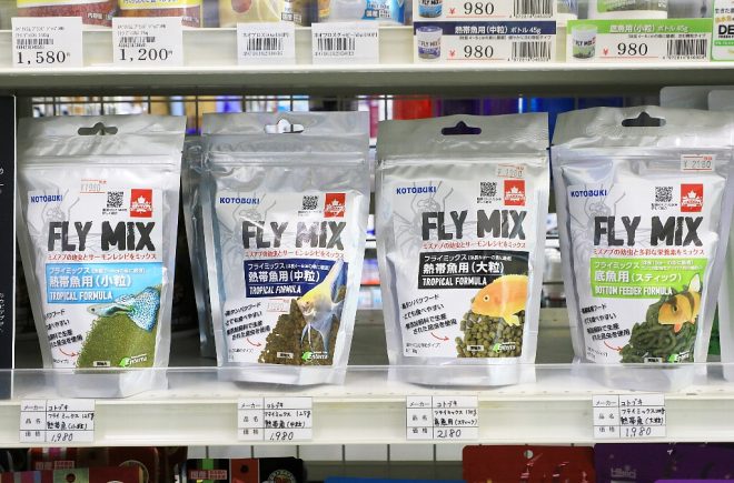 KOTOBUKIのフィッシュフード「FLY MIX」。食いつきがよく、消化不良もいいとお客さんからも好評だそう。前よりも成長が早くなったという声もあったそうで、健康志向の時代は確実に魚にもやってきています。