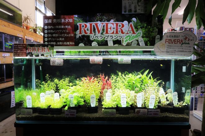魚以外にこんな水草も。福田店長のおすすめ。国産で発根系の水草「リベラプランツ」。無農薬栽培で、出荷時に虫取り処理などのメンテ済み。根張りも強くかなり丈夫なのだそう。「やっぱり自分が使ってみていいと思ったものを売りたいですからね」。説得力あります。