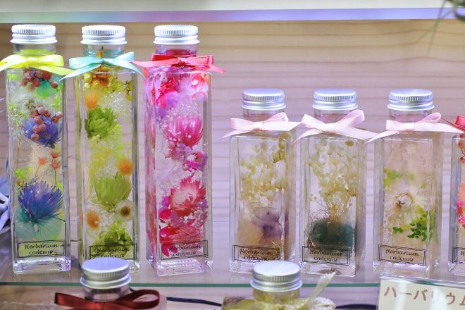 女子の間で人気の色鮮やかなハーバリウム。知り合いがつくったものを販売し始めたところ、意外なことに男性に大ウケ。普段から買っていく9割のお客さんが男性で、母の日やクリスマス前になると売上は倍増。今の時代、どこで何がヒットするか、やってみないとわからないものです。