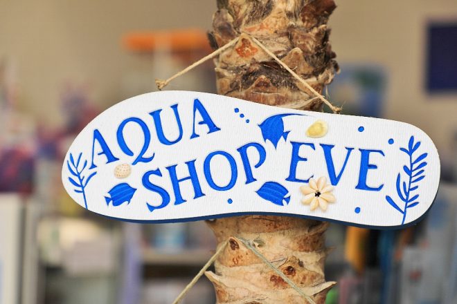 「全国的に有名なあのカジュアル衣料販売店をイメージしたんです。どんな感じの店にしようか考えていた時、最初は色々なアクアショップを見て回ったのですが、なかなかピンとこなくて」。結果、アパレル関連の店舗を参考にしながら、路面店としてもふさわしい今のイメージに落ち着いたそうです。夏の青空ともベストマッチング!