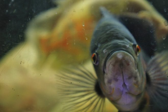 ようこそ大型魚コーナーへ(笑)。おなじみのオヤニラミやオスカー、アロワナなどの大型魚の在庫も豊富。迫力満点のサイズ感。