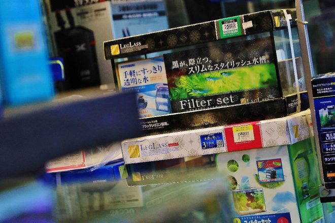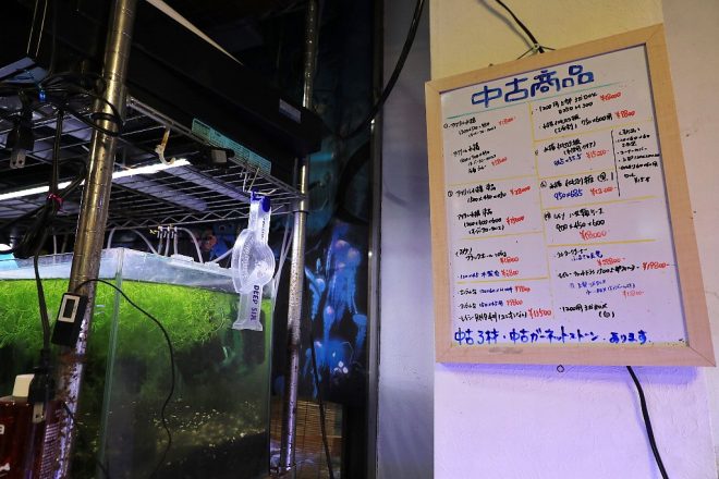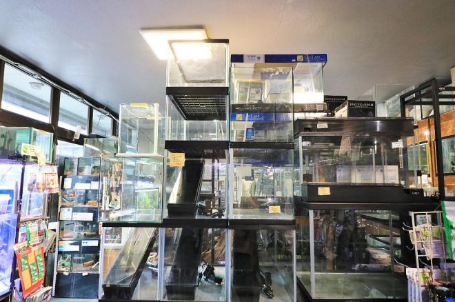 小さなきっかけから始まった、中古という新規ジャンルへの取り組み。今では水槽や部品の買い取りや販売も行うようになり、ユーザーにもすっかり浸透。「いつの間にかうちの屋台骨になりました(笑)」。どちらかといえば、店頭販売とメンテという二枚看板が多いアクアショップですが、ほかにはない独自の路線を展開しています。