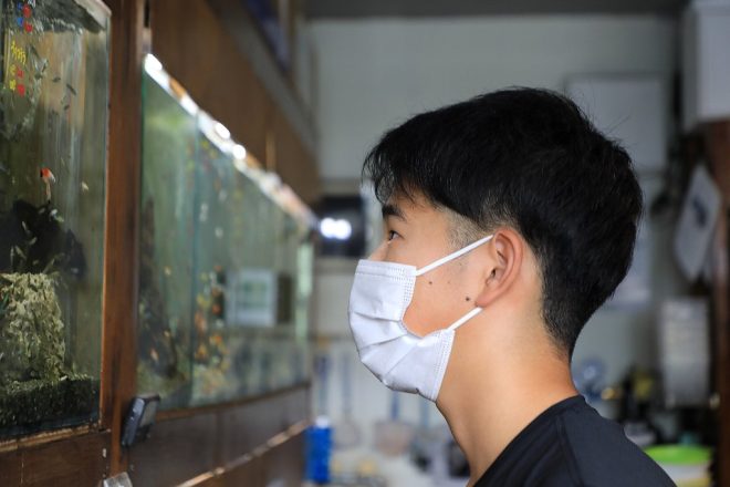 ショップから車で10分足らずのところから、お父さん・お姉さんと一緒に来店した中学3年生の小松轟大(ごうた)君。「父に、水族館に行くぞと言われてやってきました」。ん?この近辺に水族館なんてあったっけ?ああ、やっと意味がわかりました(笑)。お父さんの健一さん、アクアリストらしい素敵な誘い文句です。