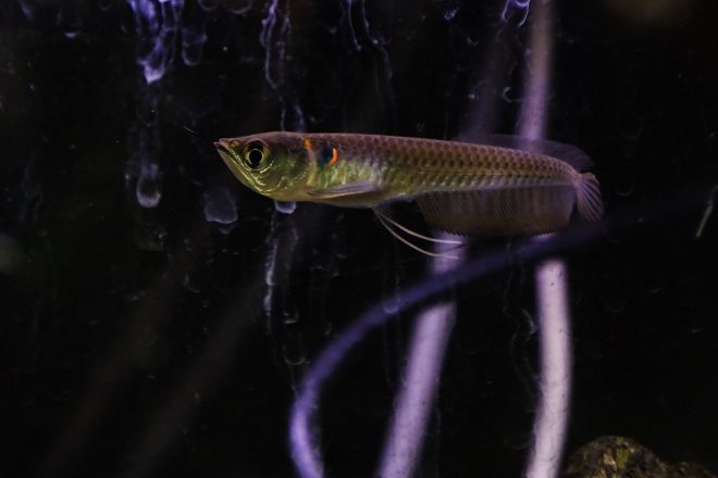 轟大君が着目したのは、何とシルバーアロワナの幼魚。「これ、めっちゃかっこいいです」。均整がとれていて、シャープなシルエットで、きらっとひかるボディには気品さも漂っています。「今は手頃な大きさなんてすが、成長するとかなりの大きさになりますからね。水槽も90~120㎝は必要になってきますよ」という米田さんのリアルなアドバイスを聞いて、轟大君撃沈(笑)。