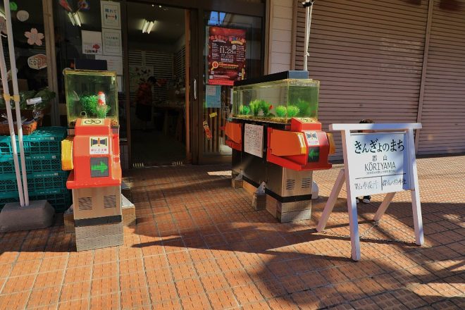 大和郡山市の柳町商店街は、別名「金魚ストリート」。数年前から、商店街のみなさんが独自に金魚を飼育し観光客にPRしようと、店先に水槽を置いてパフォーマンス。多くの商店の協力によって、大和郡山市らしいストリートが展開されています。