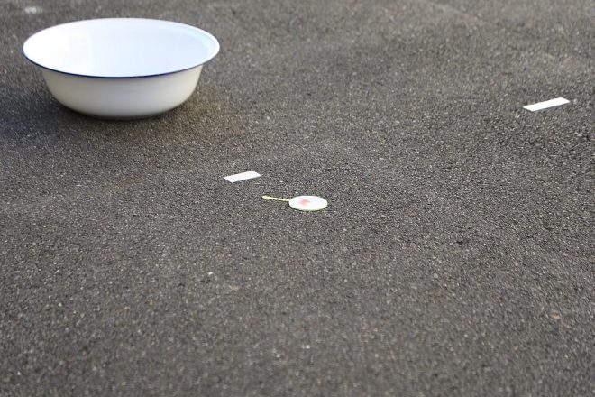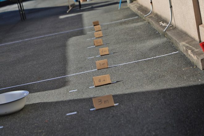 縦長の特設会場では、1mごとにラインが引かれ数個の洗面器も置かれています。投げられたポイの距離を競うだけでなく、ポイが洗面器に着地したラッキーな参加者を讃える大会でもあるんです。