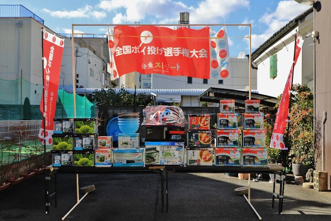 シュールなイベントの手がかりがなかなかつかめず捜査が難航していたところ、こんなイベントビジュアルを発見。よく見ると、中央あたりに気になる文言が。ポイ投げ?全国?しかも第1回?しかも金魚水槽メーカーから賞品多数予定?あー、これだー!間違いない!そうなんです、シュールなイベントの正体とは、第1回全国ポイ投げ選手権大会のことだったのです。早速現場へ向かうことになりました。