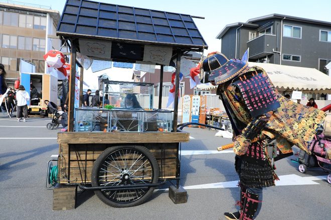 何やらアヤしいコスプレイヤー発見(笑)。ははーん、シュールなイベントというのは、鎧兜に身を包んだ武者たちのこと?ということで、早速職質(笑)。あー、もしもし。こんなところで一体何をしてるんですか?しかも、昭和レトロを感じさせる金魚売りの屋台の前で。