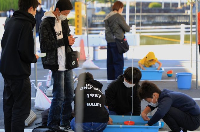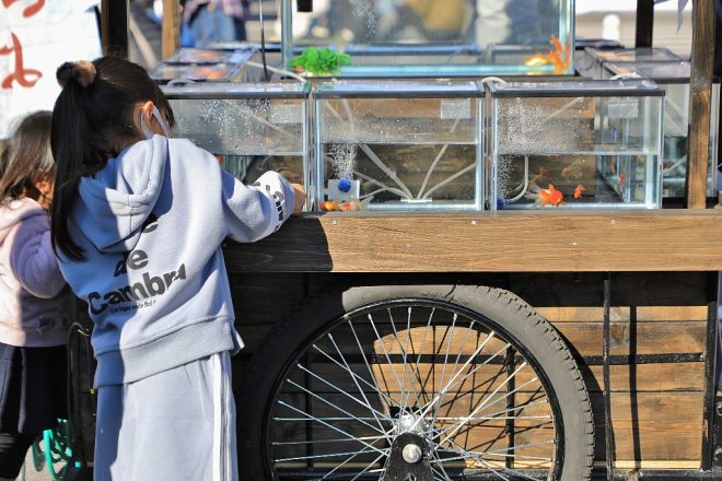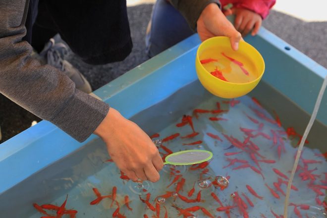 もちろん金魚すくいコーナーも大にぎわい。ポイが破れるまで、ママは頑張るからね!