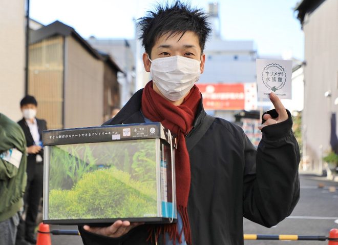 今日初めてのラッキーボーイは、何と新潟から単身赴任中という山田見吾さん。おめでとうございます!しかも賞品はKOTOBUKIのセット水槽を自らが希望。なかなか見る目あるね~(笑)。さてさて、もらったこの水槽、このあとどうするの?「会社で使うことにします!」と即答。この日は、会社のメンバーと一緒にやってきたとのことでした。