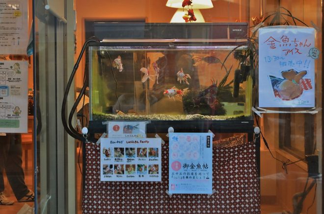 極めつけはこれ。自動改札機っぽい水槽?水槽っぽい自動改札機?まあどっちでもよろしい(笑)。とにかく、商店街のみなさんのあの手この手の努力によって、30品種の金魚が観光客たちの視線を浴びています。