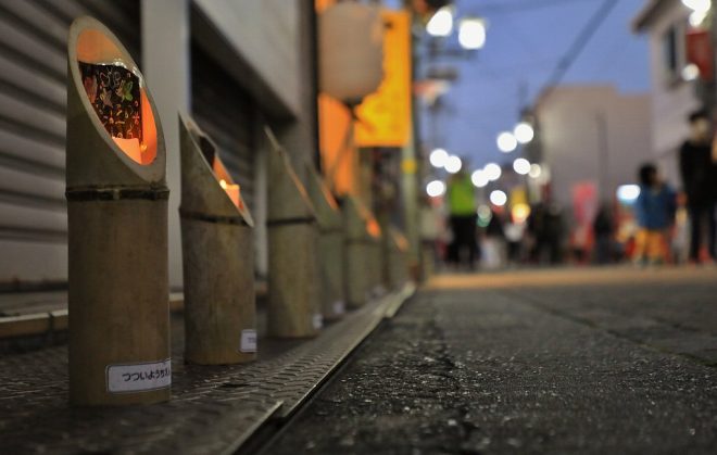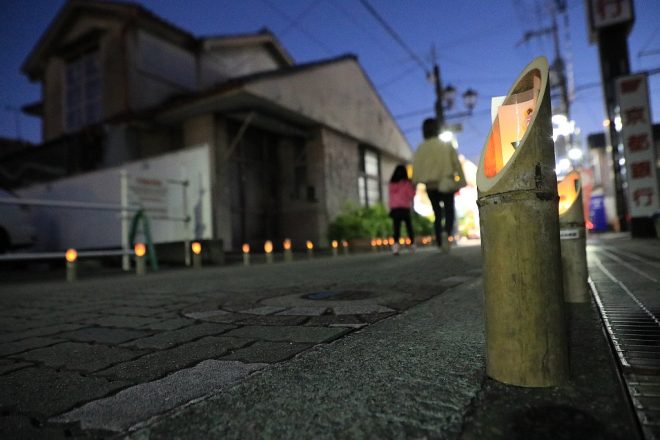 あたりが少しずつ暗くなり始め、竹灯籠にも灯がともり始めました。この竹灯籠は、地元の8つの幼稚園に通う園児さんたちにペイントしてもらったものだそうです。