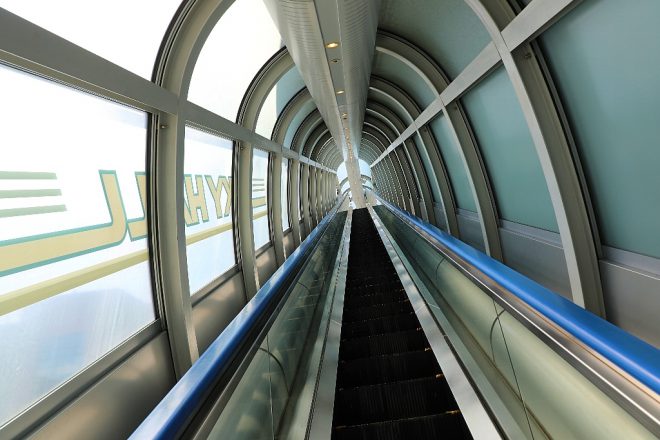 近未来的なエスカレーターで上へ上へ。ドームのてっぺん目指します。いや、天下一を目指します(笑)