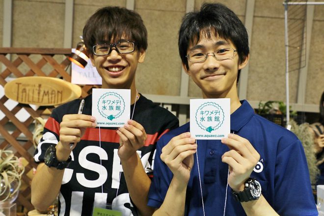 トールマンさんのブースのお手伝いをしていた青年2名発見。この子たちも大阪ECO動物海洋専門学校の学生さん。橋本竜太郎君(左)と松本侑樹君(右)。そういえば、今日初めて「キワメテ!水族館」のステッカーをプレゼント。あまりにも取材に没頭しすぎて、渡し忘れていたことをこの場で白状します(笑)