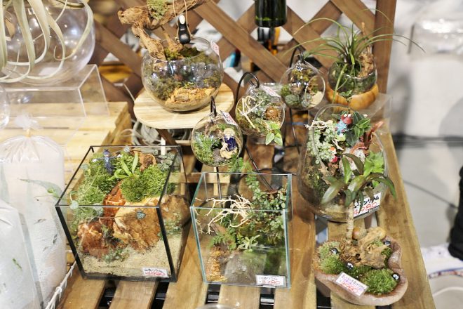 ほかにも、ついつい買って帰りたくなるようなミニサイズのテラリウムも各種。ここにも、しっかり熱帯植物が盛り込まれています。アクアショップではトールマンさんだけの出品でしたが、今後はもっとアクア系も増えて欲しい気がしました。何度も言うようですが、アクアと植物はビミョーにつながっていますから。