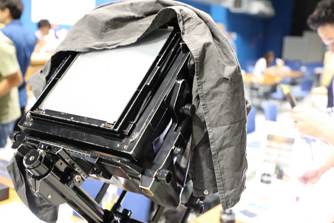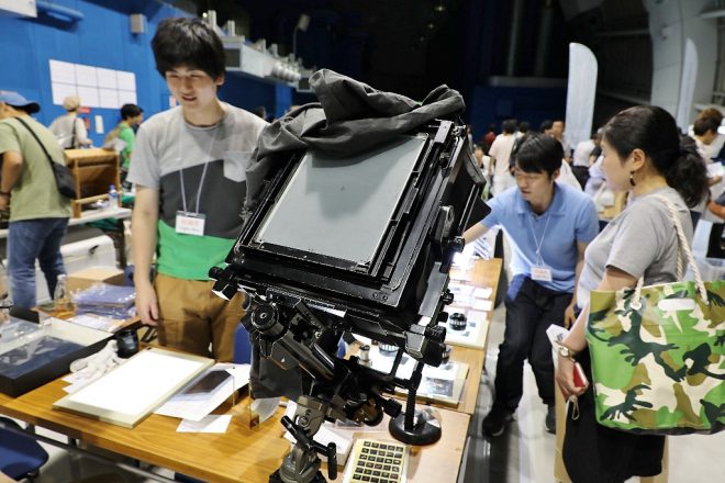 机の上に置かれているのは、昔懐かしい大型カメラで撮影されたポジフィルムの数々。あまりにも無造作に置かれているので、ここが何のブースなんだかサッパリ意味不明(笑)。そばには、おお~、これがまさに8×10(当時はエイトバイテン、もしくはバイテンと呼ばれていた)の大型カメラが。こちらもカメラマンの端くれ。何十年かぶりに遭遇した大型カメラとの遭遇に、思わず興奮してしまいました。