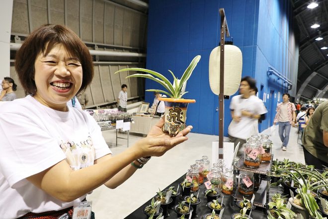 食虫植物のブースも当然。モウセンゴケやタヌキモ、ウツボカズラといった品種が代表的ですが、以前取材した八尾市在住の南あこさんは華道に食虫植物を取り入れ、しかも自宅に温室までつくってしまったという大の食虫植物好きだったことを思い出しました。