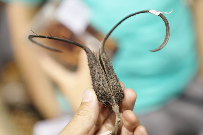 見るからにヤバい黒ツノゴマ。これも木の実の一種で、拷問道具のようなおぞましい外観から「悪魔の爪」などの英名がついています。このキャラには似合わない黄色い花を咲かせるのだそう。おそらくライオンゴロシ同様、この鋭利なツメ状のボディで動物や人にくっついて子孫を繁栄させようとしているのでしょう。見た目はエグくても、これもひとつの生きる智恵。健気に生きているのは、もしかしたら人間より植物のほうなのかも知れませんね。