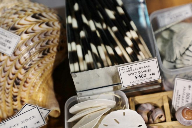 レジ前にあったのが、ヤマアラシの針。へー、こんなものまで(笑)。季節により抜け落ちる習性があるため、抜け落ちたトゲだけを販売。決してみんなで寄ってたかってヤマアラシから引っこ抜いたものではありませんので誤解なきように(笑)