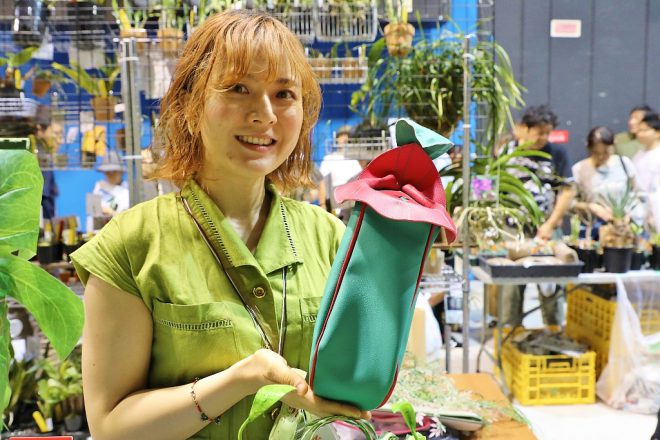 と思っていたら、ウツボカズラをモチーフとした小物を販売しているブースが近くにあったので、ちょい立ち寄り。ブースには、ウツボカズラをモチーフにしたショルダーバッグやポシェット、シザーケース、マグカップ、特製ランプなどなど。ネット販売はもちろん、咲くやこの花館(大阪市)とタイアップ販売もしているそうです。
