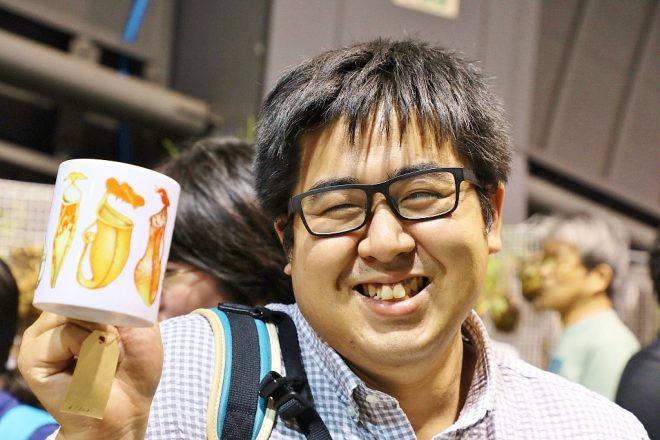 取材中にブース前を通りかかった男性。植物オタクかと思いきや、何と大阪動植物海洋専門学校(OAO)の北林遼也先生。こりゃ失敬(笑)。聞くところによると、2年前4月に「ポタジェガーデニングコース」が新設されたとのこと。これは初耳でした。OAOというと数年前に取材したペット専門学校なんですが、植物に精通したプロを育成するための新コース。北林先生自身も水槽レイアウトを担当しているらしく、やっぱりアクアとの接点は少なからずあるみたいで「機会がありましたら、またぜひ取材にお越しください!」と、ちょっとだけ兄弟漫才師・ミキの昴生似の北林先生(笑)。この日、残り1個となったウツボカズラのイラスト入りマグカップをご購入。きっと生徒に、「どや、これ可愛いやろ?」と自慢するに違いありません(笑)
