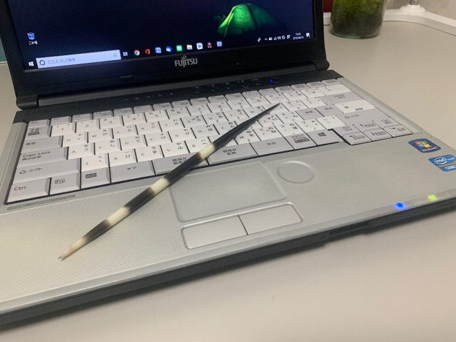 両先端ともかなり鋭利です。針のように尖っています。大きさがわかるようにノートPCの上に置いてみました。え?買って帰ったんかいって?はい、予算の都合でこちらをチョイスしました。ライオンゴロシは財布ゴロシでもありましたから(笑)