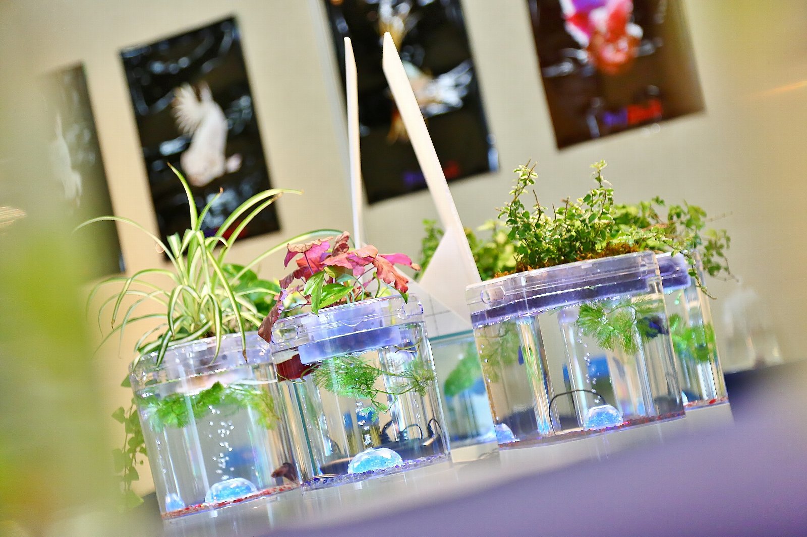 熱気を帯びた会場でひときわ涼感を漂わせていたのが、LEDと水泡効果がファンタジックな雰囲気を演出していた6個の「アクアポニックス」。今回のメインスポンサー企業、KOTOBUKI製です。オールインワンタイプで、照明とエアポンプが一体化。しかも上部には水耕栽培が可能な二段式というユニークな樹脂製水槽は、会場のランドマークとしても来場者の注目を集めていました。(アクアポニックスの詳しい商品説明はこちら)