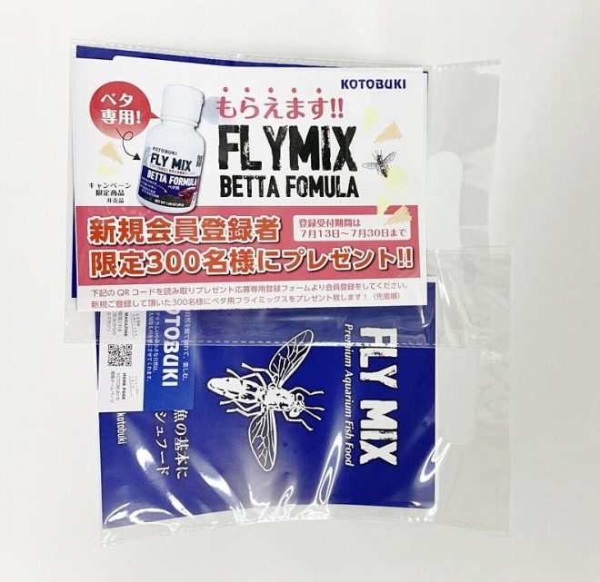 プレゼントは、新製品情報などを発信するKOTOBUKIの新規会員登録をしてくれたユーザーが対象となります。簡単な会員登録をするだけで、抽選でFLY MIXベタ用バージョンが当たるビッグチャンスなのです。このチャンスを逃したら、ベタ用バージョンはもう2度と手に入らないかも知れないんです!