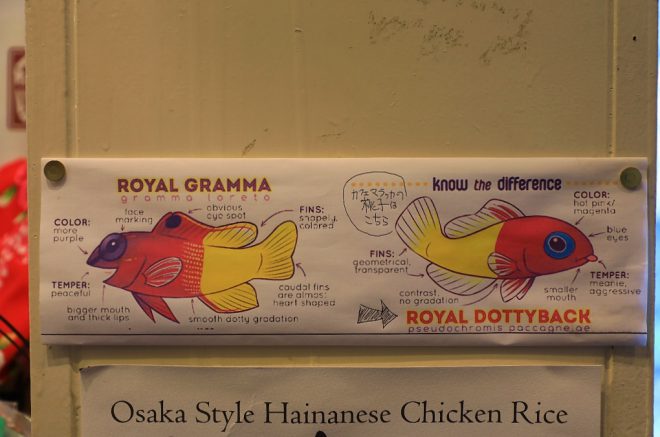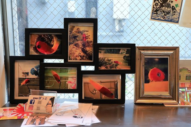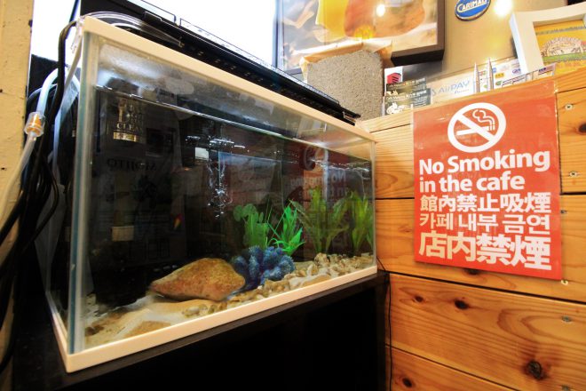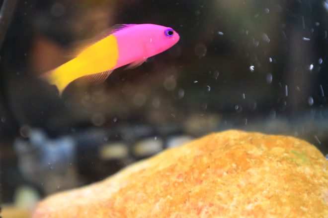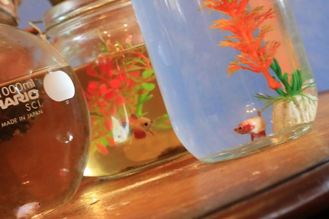 さて、そろそろ本題に入らないと。店内の魚をご紹介しないといけません。また何で魚を置くことに?「近所の人が立ち寄ったお店に魚がたくさん置いてあって、それを動画で撮ったものを見せてもらったんです。もう一目惚れしちゃいまして!」。