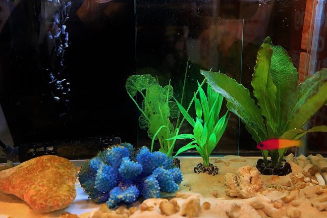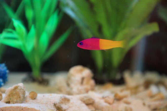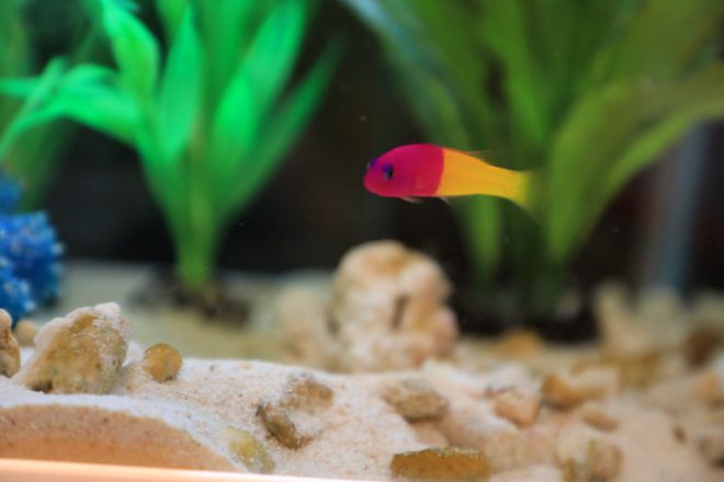 人工サンゴなどでカラフルにレイアウトされた水槽。現在は1匹ですが、「なかなか気の強い子なので」って、もしかしたら田畑さん似(笑)?