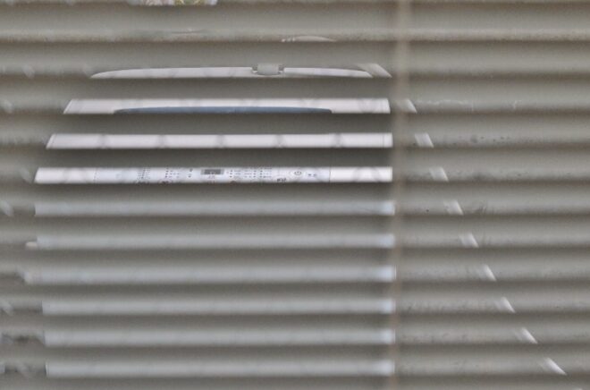 ブラインド越しに外を見ると、洗濯機までもが鎮座。