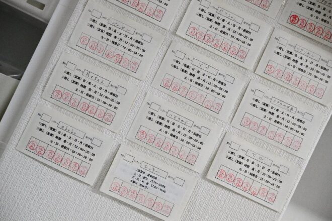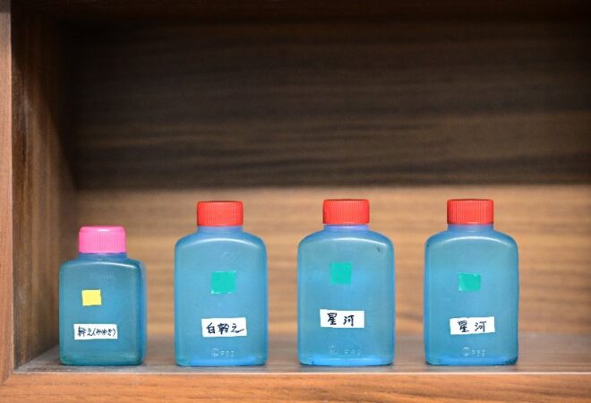 メダカといえばこのシール。平松さん曰く、「やっと一人前のメダカを作出することができましたという自分自身の証であると同時に、メダカユーザー同士の名刺代わりに使っておられますよね」。今ではすっかり定番になったアイテムですが、「私たちが若いころにはなかったです」。