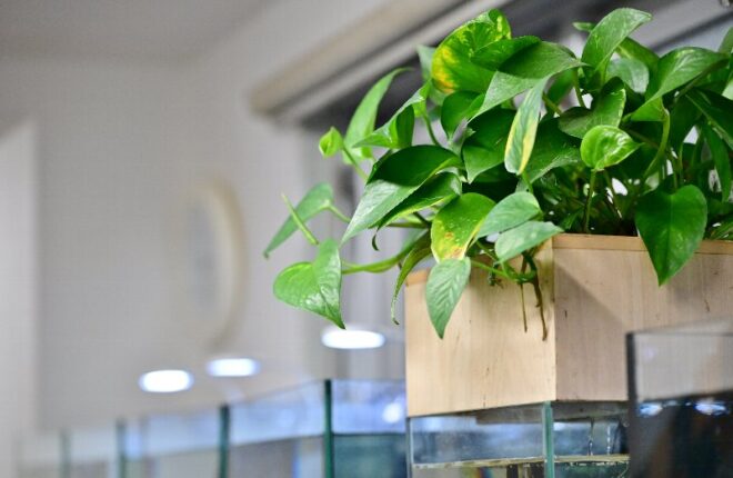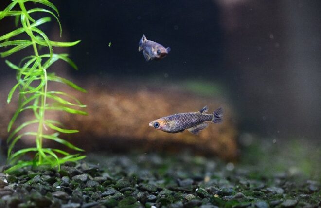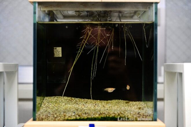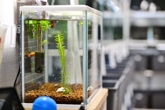 こんな遊び心のある水槽も。植物が根を張り、メダカがスーイスイ。植物とのコラボもバッチリなアクア流二段活用。