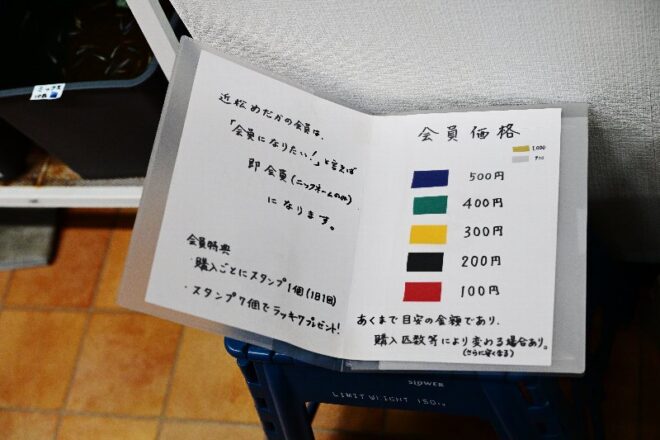 一応会員制。1回の買い物でスタンプを1個捺印。7個達成すると、市販価格1,000円のメダカが1匹もらえるとか。ということはですねー、1匹100円のメダカを7回買えば、それよりも高いメダカがもらえるということ?「そうですよ~、お得でしょ?アッハッハッハ(笑)」。あかん、この人まるで神や。
