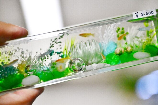 メダカ以外にハーバーリウムの制作も手がける平松さん。