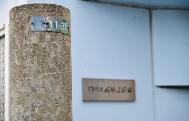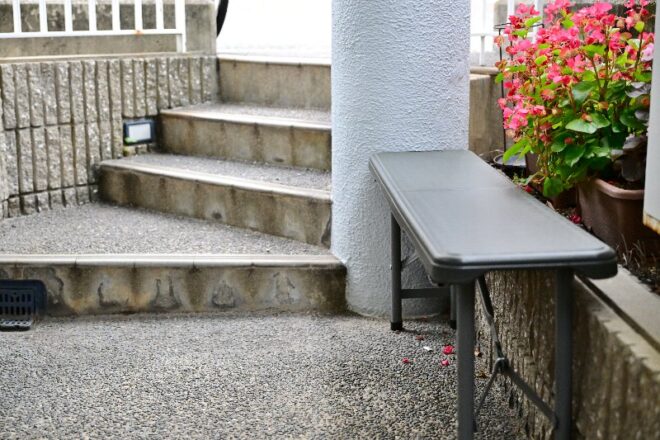 マンションのエントランスから5段降りると右手に入口。反対側には2~3人が座れる長椅子も。混雑時にここで待機してもらうためのアイテムにほかなりません。そう、オープンした2年前といえばコロナ禍真っ只中でしたから。にしても、待ち会いコーナーまであるとは、何と心優しい。