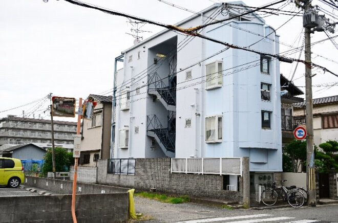 阪急・武庫之荘駅から歩いて約10分。閑静な住宅街で突如目の前に立ちはだかった、ユニークなスタイルのマンション。マンション名にアトリエのという文字が盛り込まれているせいか、外観はどことなくクリエイティビティ。
